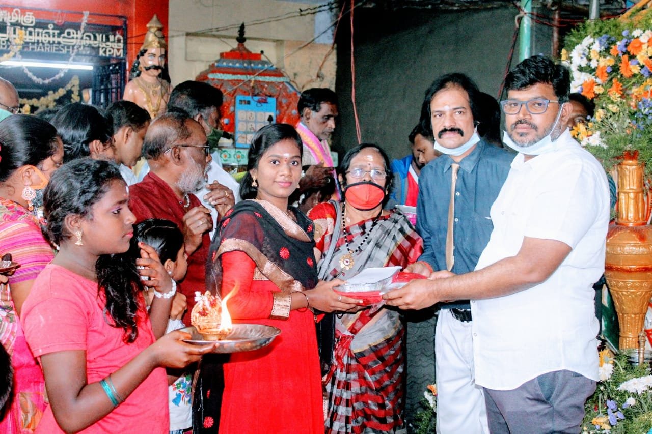 In Thiruvothyur Iyyapan seva sangam umsm president Lakshmi Rajaram presented Nalathirangals sarees and vilakku pooja started by her.